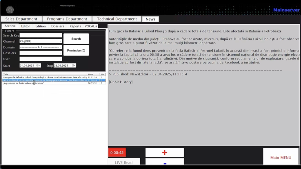 Ai la dispoziție o bază de date ușor de navigat, iar pentru introducerea unei noi știri, procedura e foarte simplă: adaugi sursa, domeniul, titlul, intro-ul și textul complet al fiecărei știri. Poți selecta inserturi audio, le inserezi direct în editor, salvezi și gata — ai totul pregătit pentru buletinul de la ora 20 sau oricare altul. Creezi ediția, selectezi ce știri intră, salvezi și… citirea poate începe. Practic, ai un prompter integrat care îți oferă un flux de lucru curat și profesional. Fix ca în video-ul* explicativ de AICI.